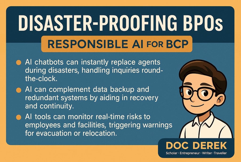 This paper examines the Cebu case as a critical turning point for the Philippine BPO sector. It situates the incident within existing occupational safety and health (OSH) laws and global continuity standards such as ISO 22301 and NIST 800-34. Drawing from global case studies, the paper explores how artificial intelligence (AI) can strengthen continuity by automating client-facing functions during disasters, reducing human exposure, and supporting rapid recovery. It argues that integrating AI into continuity frameworks is essential for balancing client demands with worker welfare, ensuring resilience, and preserving the industry’s global competitiveness.